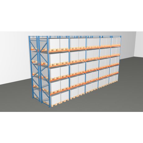 Das Palettenregal besteht aus insgesamt 2x5 Regalfeldern mit einer Breite von 1.825 mm und bietet Platz für 100 Europaletten (inklusive Bodenebene). Der Abstand zwischen beiden Regalzeilen beträgt 200 mm.