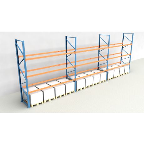 Das Palettenregal besteht aus insgesamt 3 Regalfeldern mit einer Breite von 3.600 mm und bietet Platz für 48 Europaletten (inklusive Bodenebene).