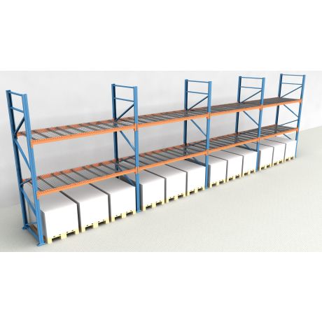 Das Palettenregal von NEDCON Lagertechnik hat Abmessungen von 7.500x11300x1.100 mm (HxBxT) und verfügt über 3 Lagerebenen. Jedes Regalfeld ist mit 2 Traversenebenen ausgestattet und kann je Ebene mit bis zu 3.000 kg (1000 kg je Europalette) belastet werden. Die maximale Feldlast beträgt 12.000 kg und darf niemals überschritten werden. Die lichte Fachhöhe zwischen den einzelnen Ebenen beträgt 2.400 mm. Die Palettenregal Traversenebenen sind mit Gitterböden vom Typ MantaMESH in der 750 kg Variante (je Palettenplatz) ausgestattet.