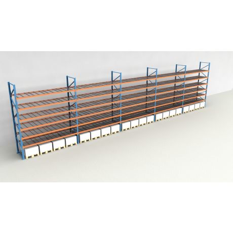 Das Palettenregal von NEDCON Lagertechnik hat Abmessungen von 7.500x18600x1.100 mm (HxBxT) und verfügt über 7 Lagerebenen. Jedes Regalfeld ist mit 6 Traversenebenen ausgestattet und kann je Ebene mit bis zu 3.000 kg (750 kg je Europalette) belastet werden. Die maximale Feldlast beträgt 12.000 kg und darf niemals überschritten werden. Die lichte Fachhöhe zwischen den einzelnen Ebenen beträgt 950 mm. Die Palettenregal Traversenebenen sind mit Gitterböden vom Typ MantaMESH in der 750 kg Variante (je Palettenplatz) ausgestattet.