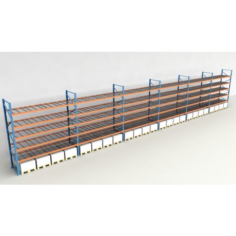 Das Palettenregal besteht aus insgesamt 6 Regalfeldern mit einer Breite von 3.600 mm und bietet Platz für 144 Europaletten (inklusive Bodenebene).