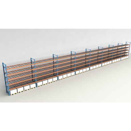 Das Palettenregal von NEDCON Lagertechnik hat Abmessungen von 7.500x29700x1.100 mm (HxBxT) und verfügt über 6 Lagerebenen. Jedes Regalfeld ist mit 5 Traversenebenen ausgestattet und kann je Ebene mit bis zu 3.000 kg (750 kg je Europalette) belastet werden. Die maximale Feldlast beträgt 12.000 kg und darf niemals überschritten werden. Die lichte Fachhöhe zwischen den einzelnen Ebenen beträgt 1.150 mm. Die Palettenregal Traversenebenen sind mit Gitterböden vom Typ MantaMESH in der 750 kg Variante (je Palettenplatz) ausgestattet.